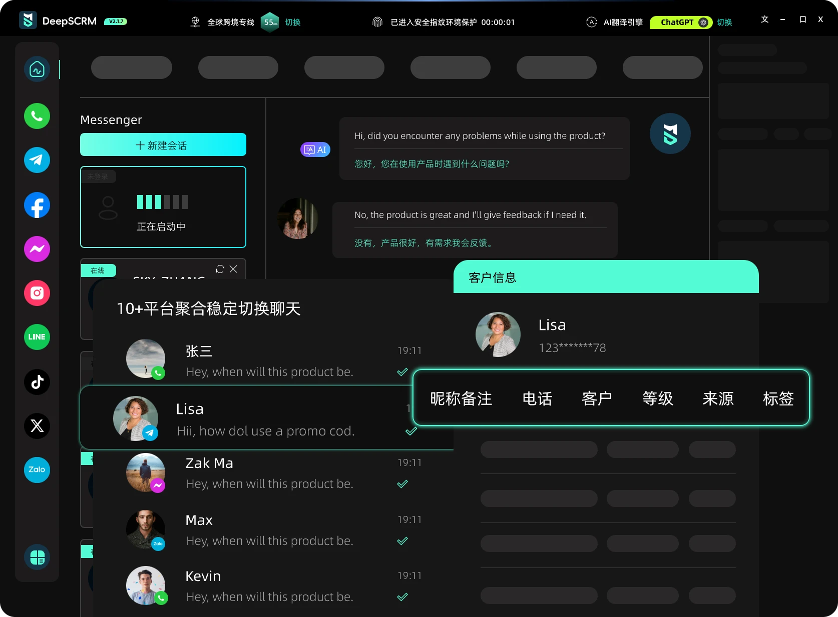 支持全球主流社交媒体,通过 AI 实时翻译、指纹级风险风控、高效营销辅助 三大核心技术 助力企业实现从流量承接、实时跨语言沟通到私域精准转化的闭环管理